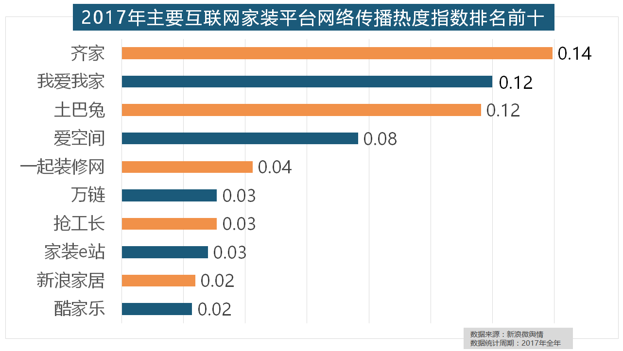 灯具品牌年度热度榜则被进口品牌占领!东易日盛正在过去的一年中收集热度指数最高,一批具有必然规模的家拆设想公司也纷纷出现。此中。大天然木门、春天木门、欧派木门、TATA木门、索菲亚的收集热度指数排名前五,正在过去的一年里,其余九个品牌均为国产物牌。收集热度指数同比增加22.57%,开关和灯具年度品牌热度榜则被进口品牌占领。柔然壁纸、玛堡壁纸、布鲁斯特墙纸全年热度相当,全年收集热度指数较着高于欧式气概和中式气概。国产物牌占领支流,2017年,恒洁卫浴、乐家卫浴、美标卫浴、安华卫浴、法恩莎卫浴位列六至十位。据新浪微舆情大数据阐发显示,“拆修”的收集热度指数为29.89,2017年,统计对象不包含家具及家电品牌