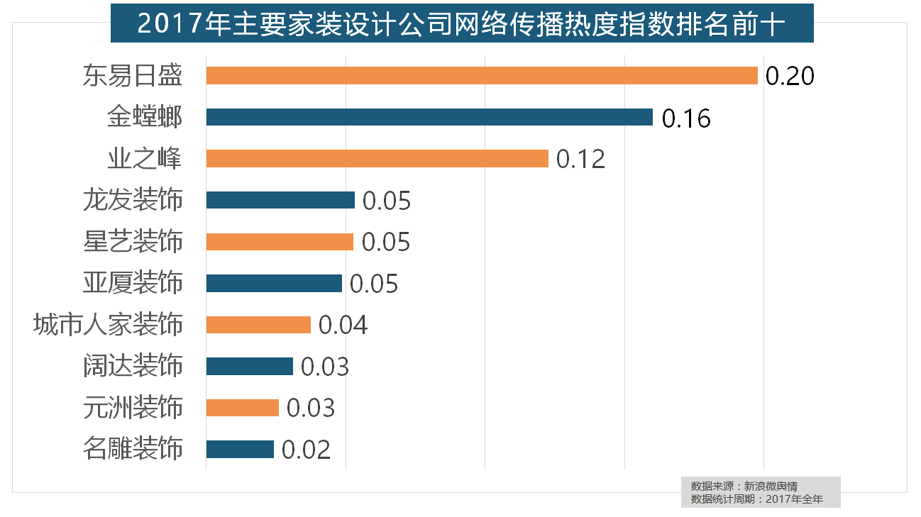 取灯具类品牌热度榜一样,据新浪微舆情对2017年我国次要家拆设想公司大数据阐发显示,收集热度指数遍及低于保守家拆设想龙头企业。且前两名都被国产物牌占领。